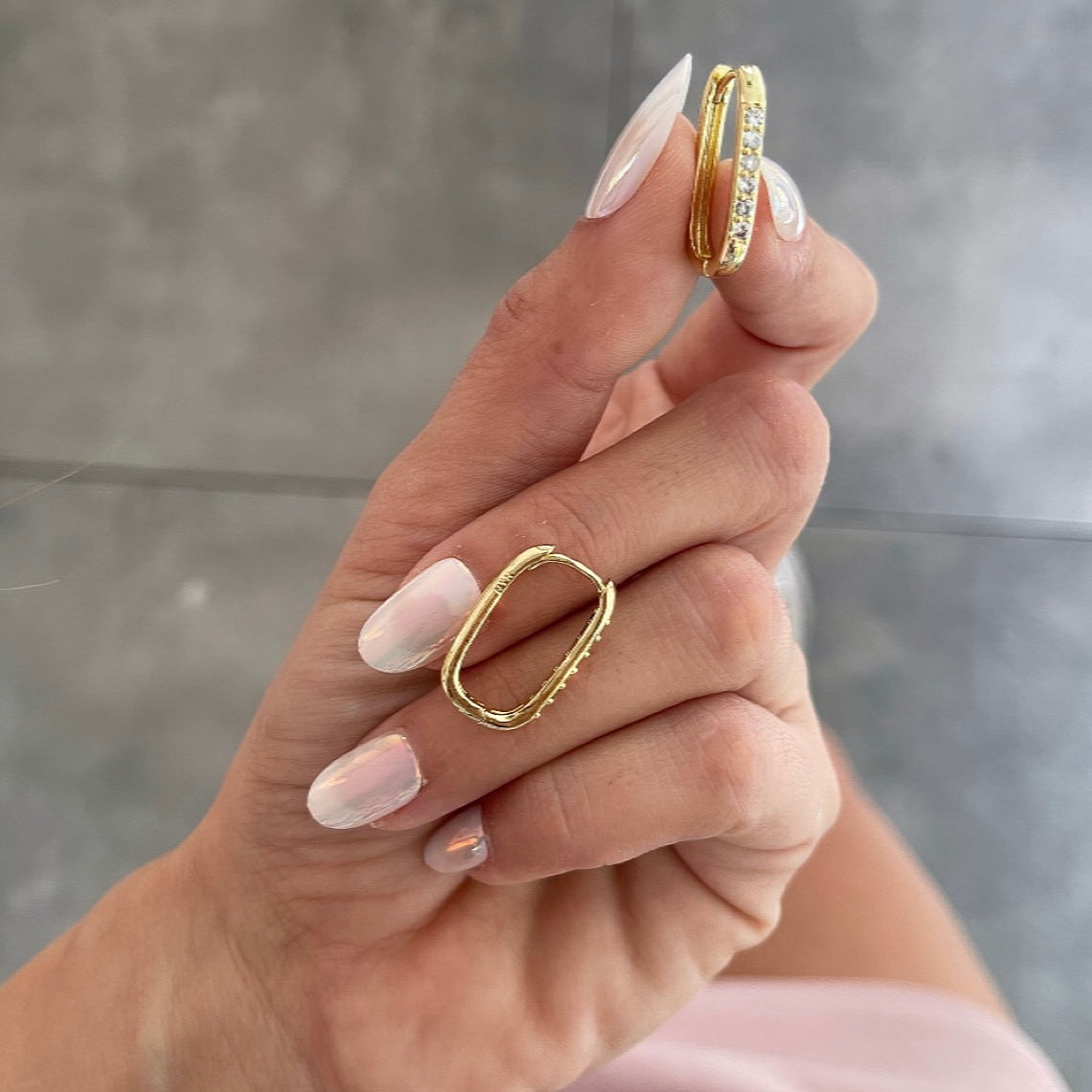 עגילים אליפסה חלולה משובצת לאורך זהב