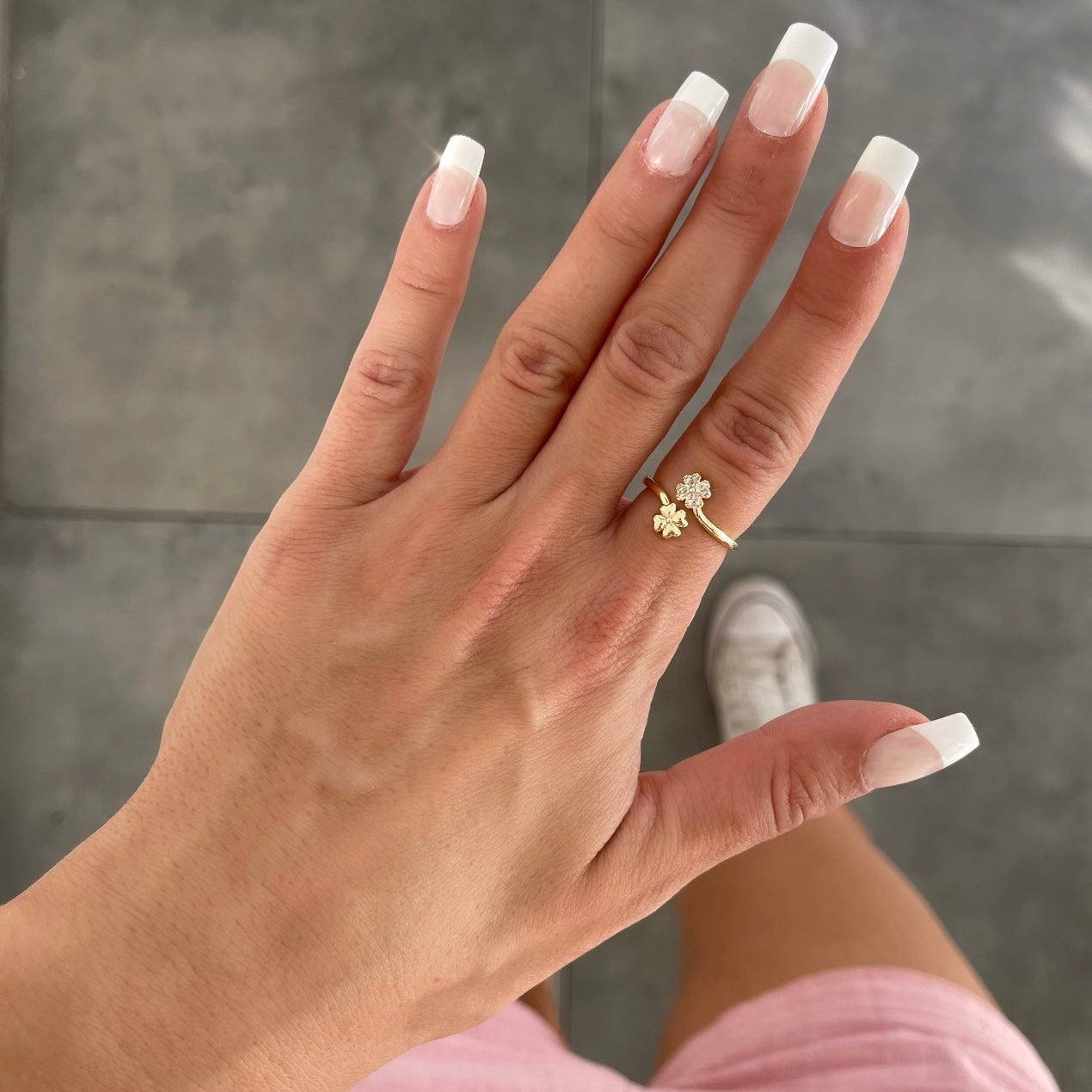 טבעת פתוחה 2 פרחים משובץ חלק זהב