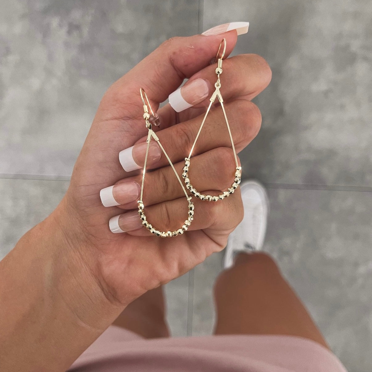 עגילים חוט צורת טיפה חלולה עם כדורי לייזר מושחלים זהב