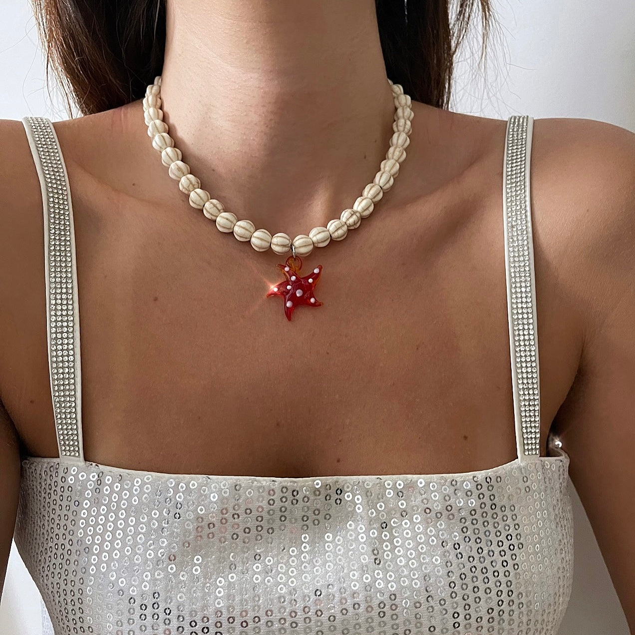 שרשרת אבנים עגולות לבנות מיוחדות עם כוכב ים אדום עם נקודות לבנות כסף j