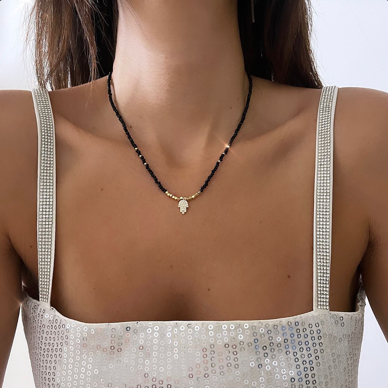 שרשרת חרוזים שחורים דקים עם חמסה זהב r
