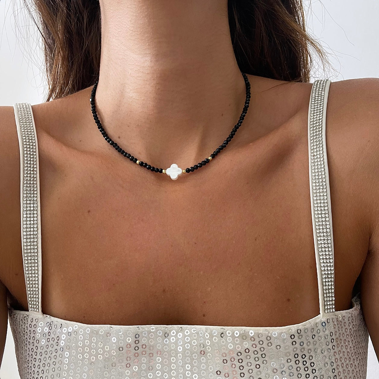 שרשרת חרוזים שחורים השחלה טולי פנינה לבן זהב