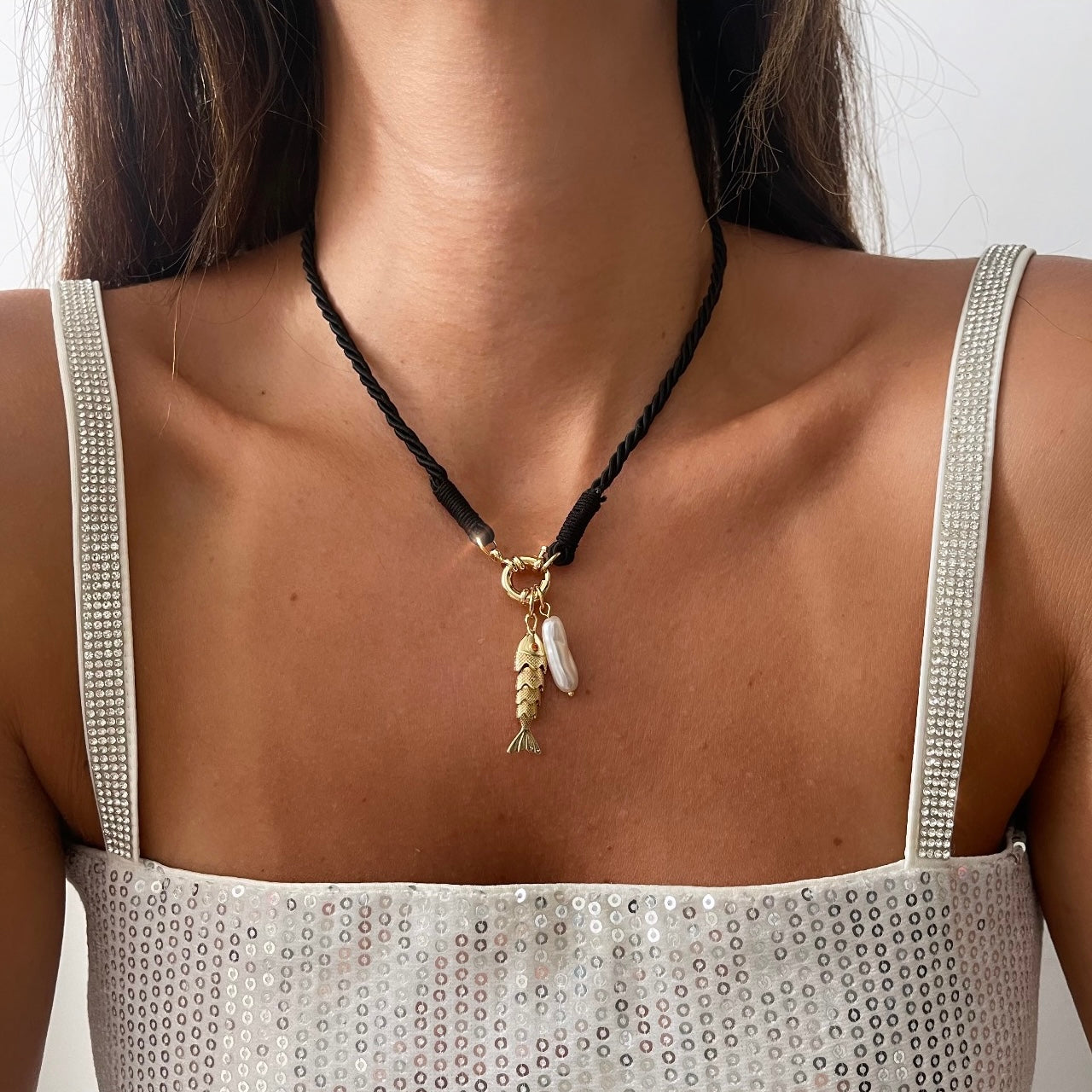 שרשרת חוט שחור אן פנינה מלבנית דג זהב j