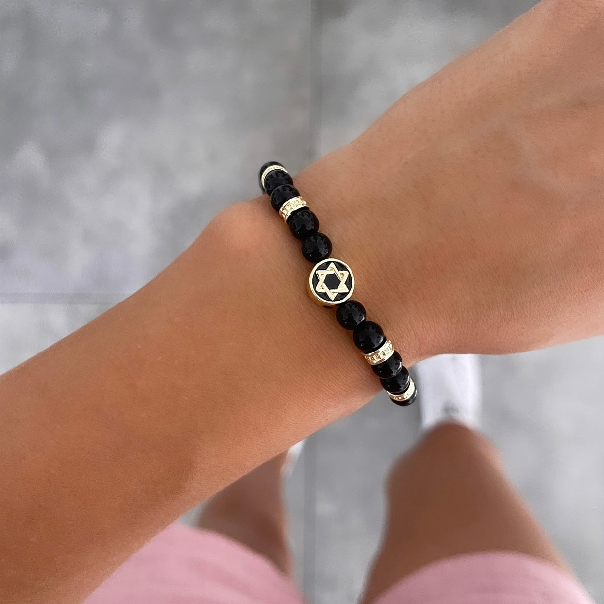 צמיד חרוזים שחורים מגן דוד מושחל זהב