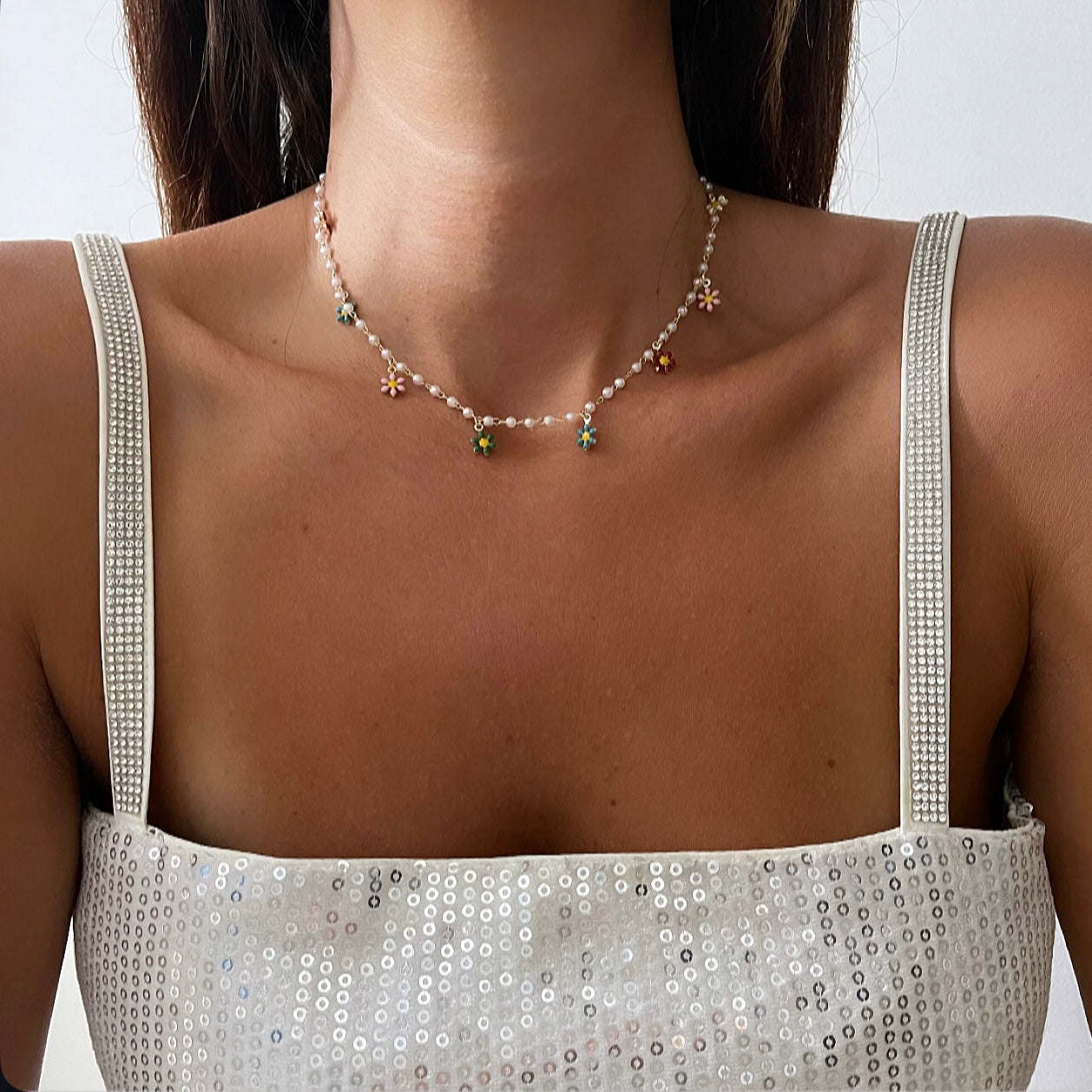 שרשרת פנינים פרחים צבעוני לאורך השרשרת זהב