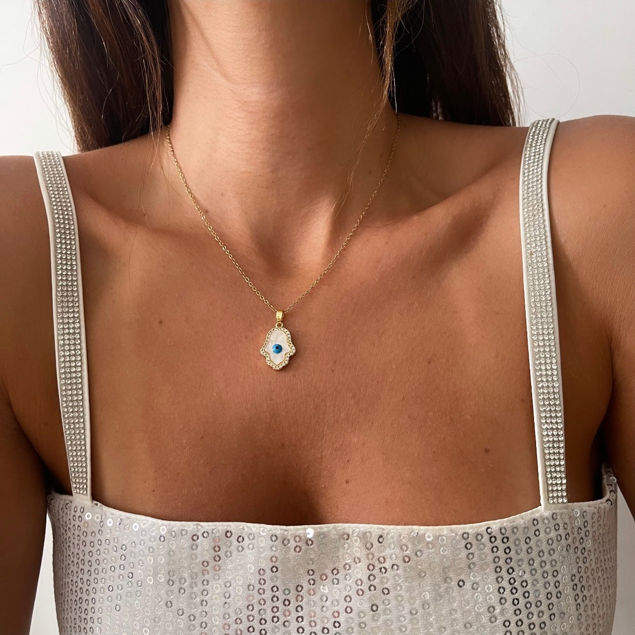 שרשרת חמסה לבנה עין טורקיז בפנים זהב r