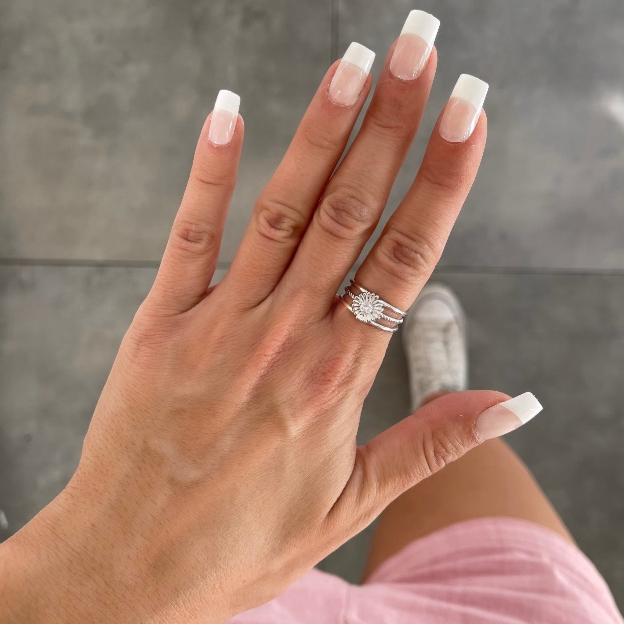 טבעת 3 שורות פרח באמצע זירקון כסף