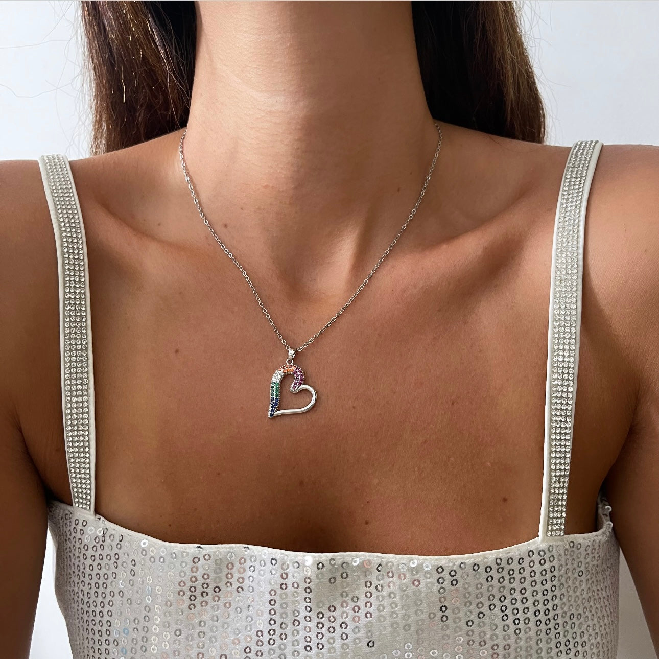 שרשרתלב חלול חצי משובץ צבעוני כסף