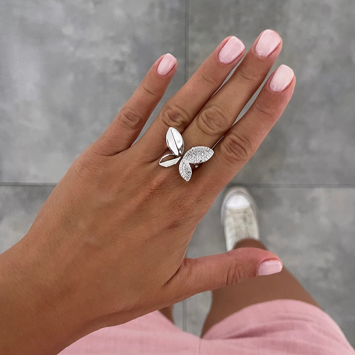 טבעת פרפר חצי משובץ חצי חלק כסף