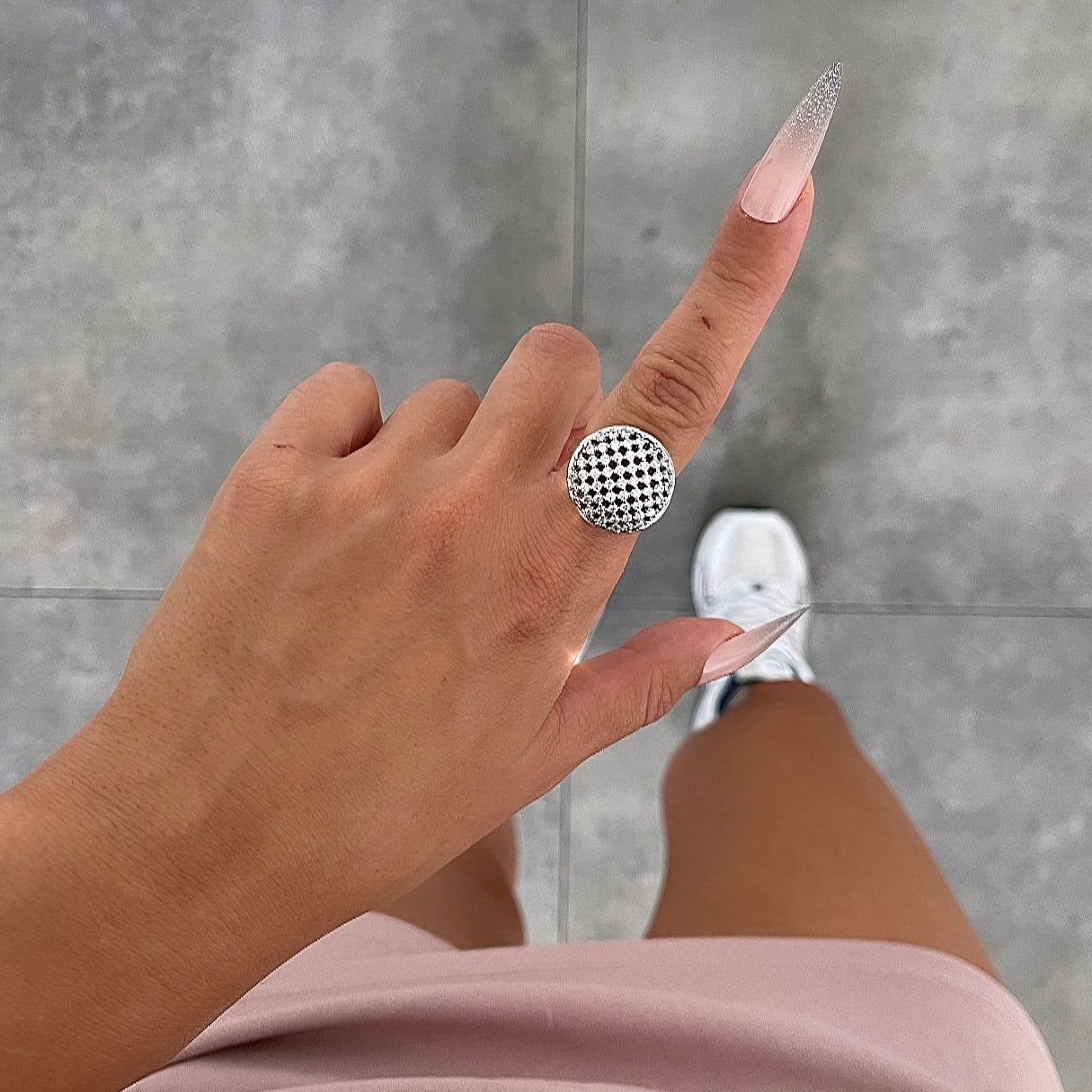 טבעת פתוחה עיגול גדול מחוררת ריבועים כסף