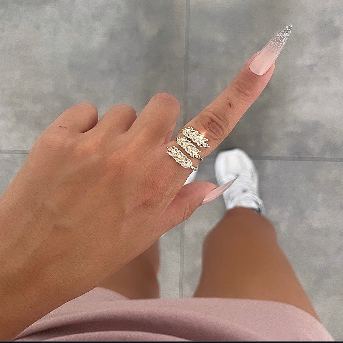 טבעת 3 שורות עלים משובץ שקוף זהב