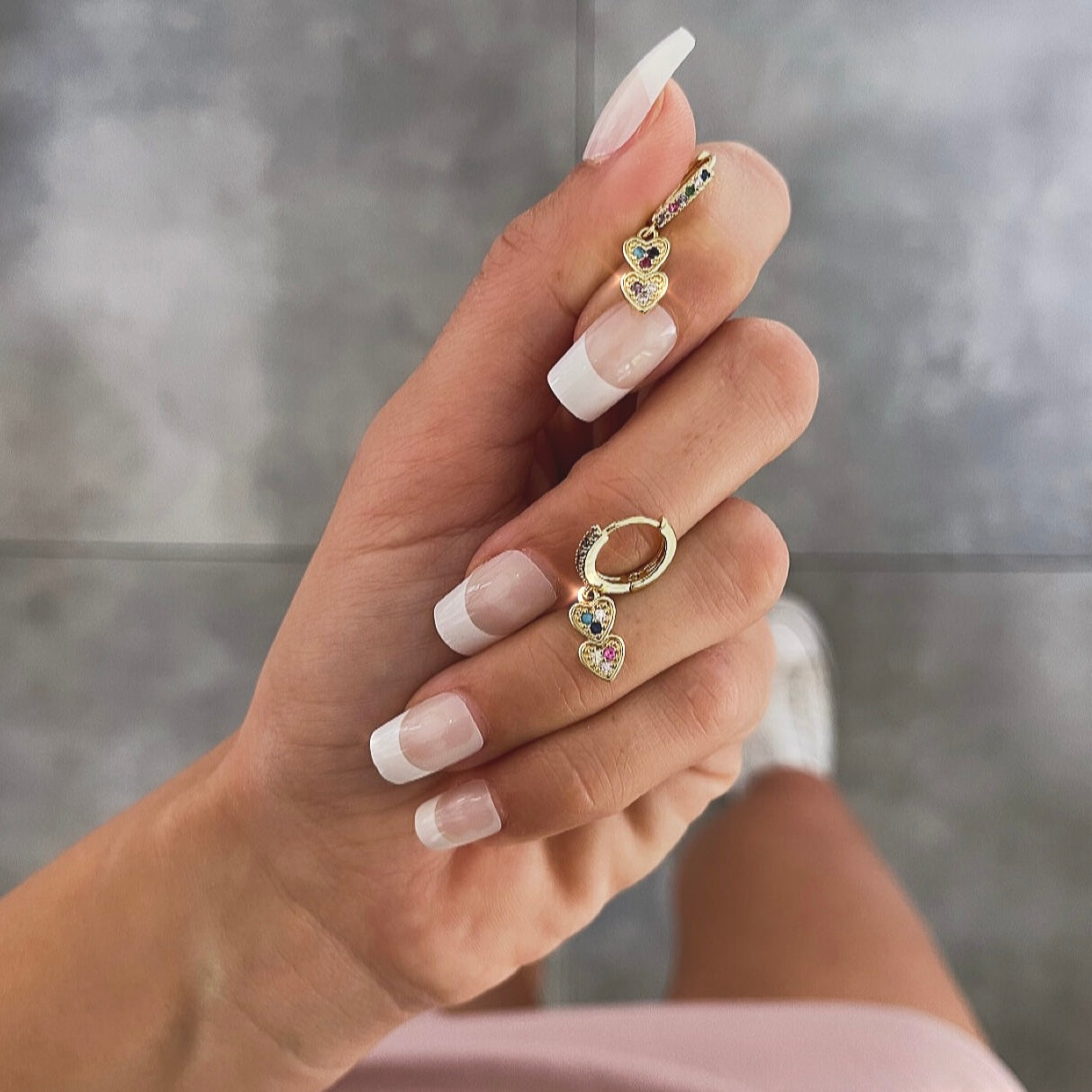עגילים 2 לבבות צבעוניות לאורך תלויים זהב