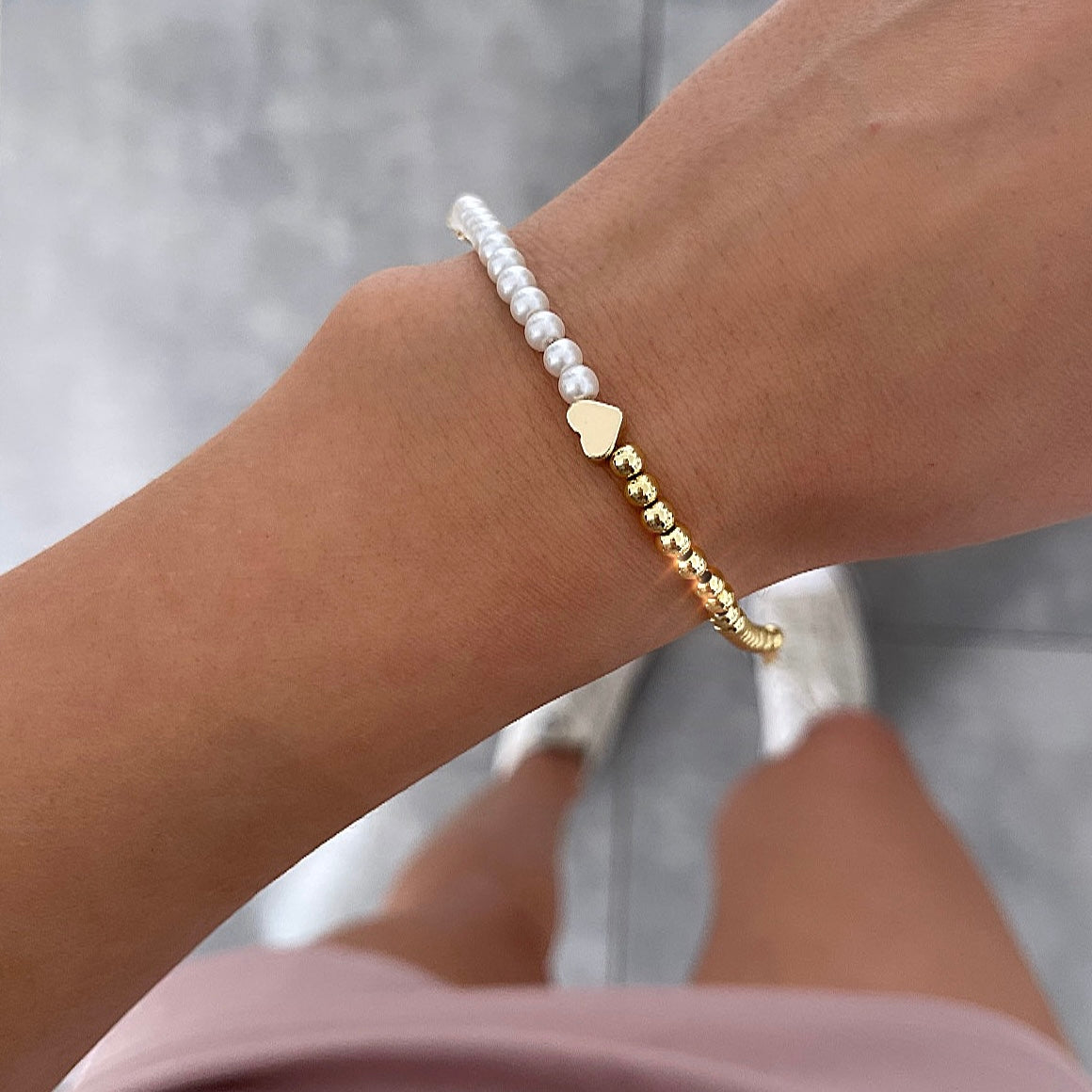 צמיד חצי פנינים חצי כדורים לב באמצע זהב