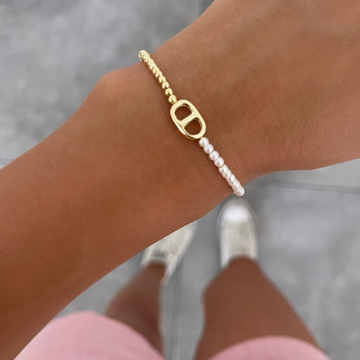 צמיד חצי פנינים חצי כדורים באמצע אליפסה חתוכה זהב