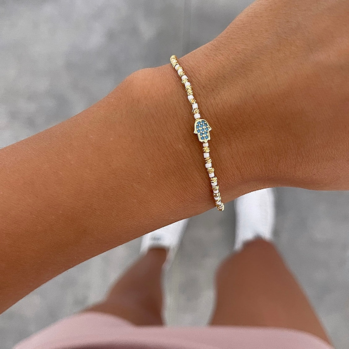 צמיד דידי חמסה טורקיז מסביבו חרוזים לבנים וכדורי זהב