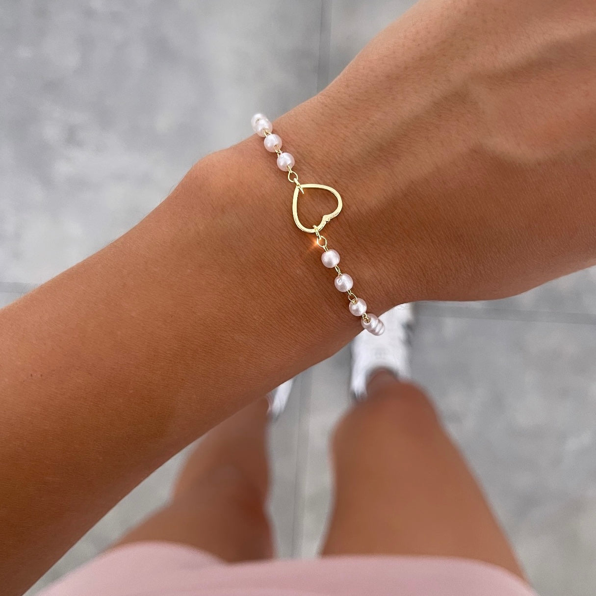 צמיד חוט פנינים באמצע לב חלול קטן זהב
