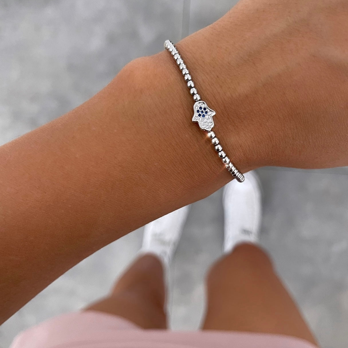 צמיד כדורים חמסה אמצעית עם פרח נקודות כחול עליו כסף