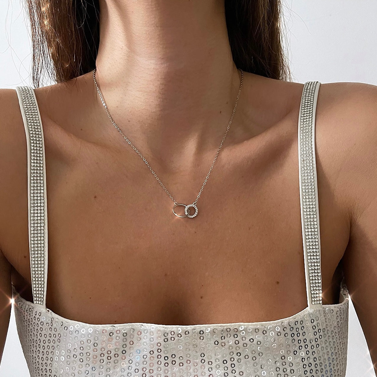 שרשרת 2 עיגולים מחוברים אחד משובץ כסף