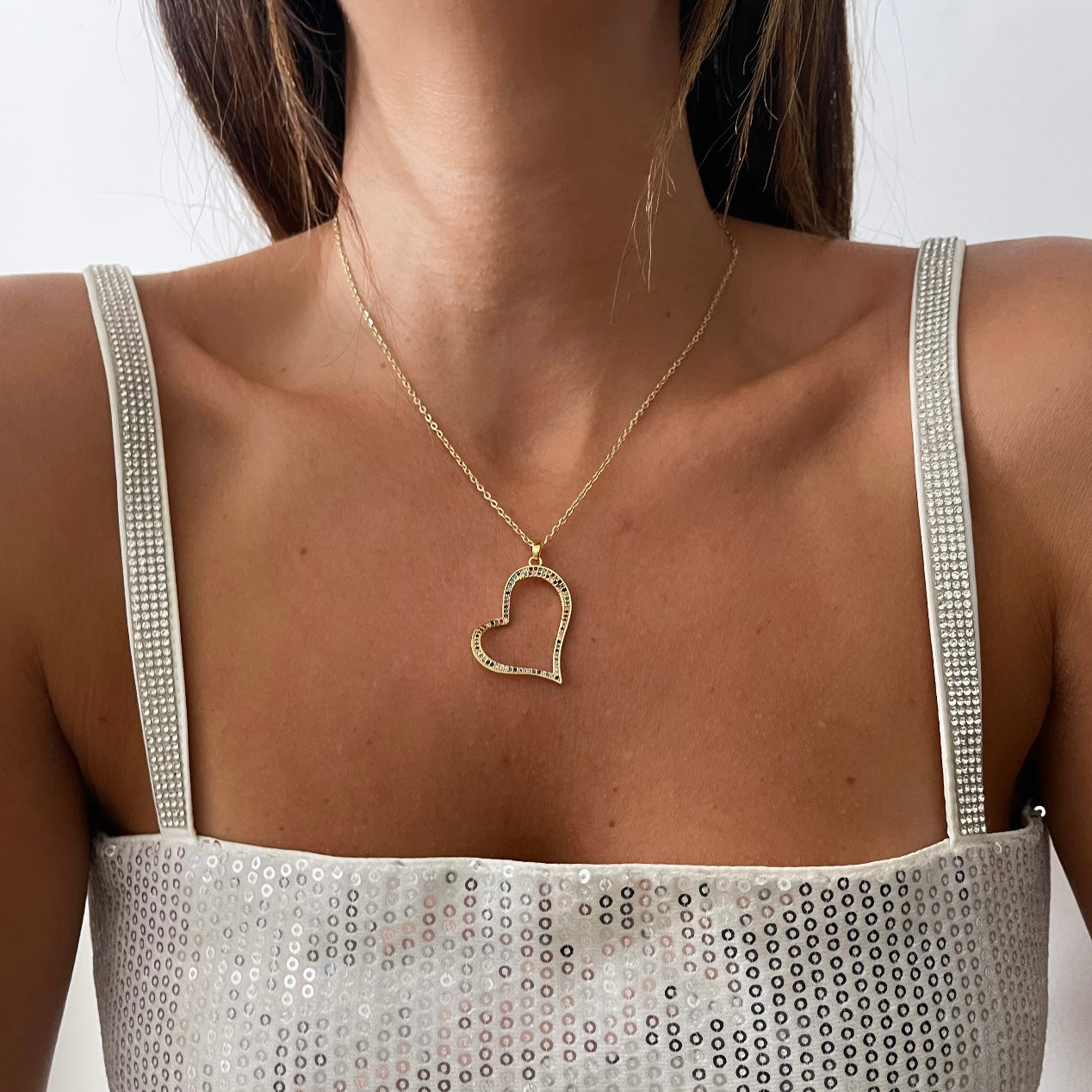 שרשרת לב ענק ענקי אלכסוני חלול צבעוני מסביב זהב