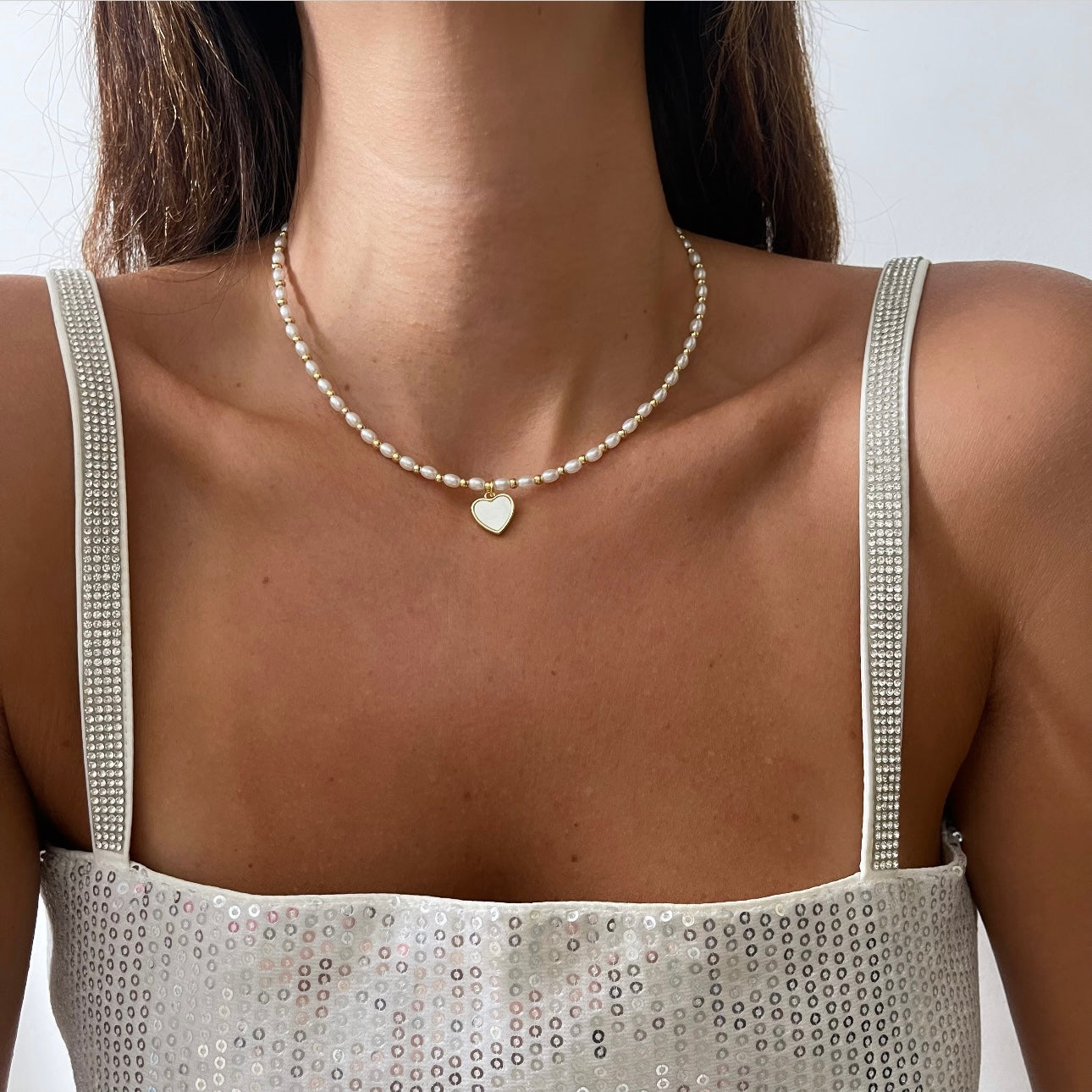 שרשרת חרוזים לבן/זהב תליון לב קטן פנינה מסגרת זהב