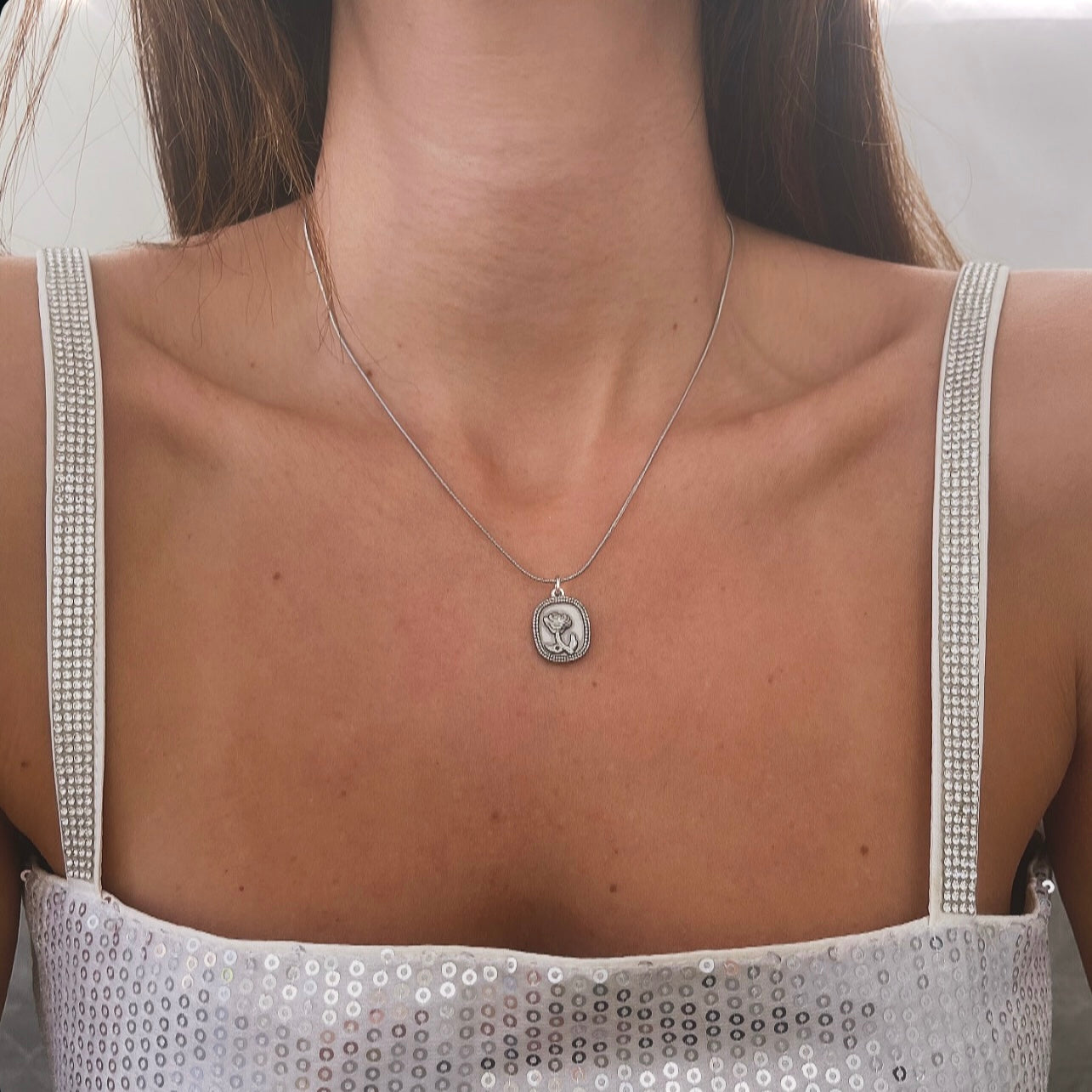 שרשרת חוט דקה דקה תליון מלבן פרח חרוט כסף