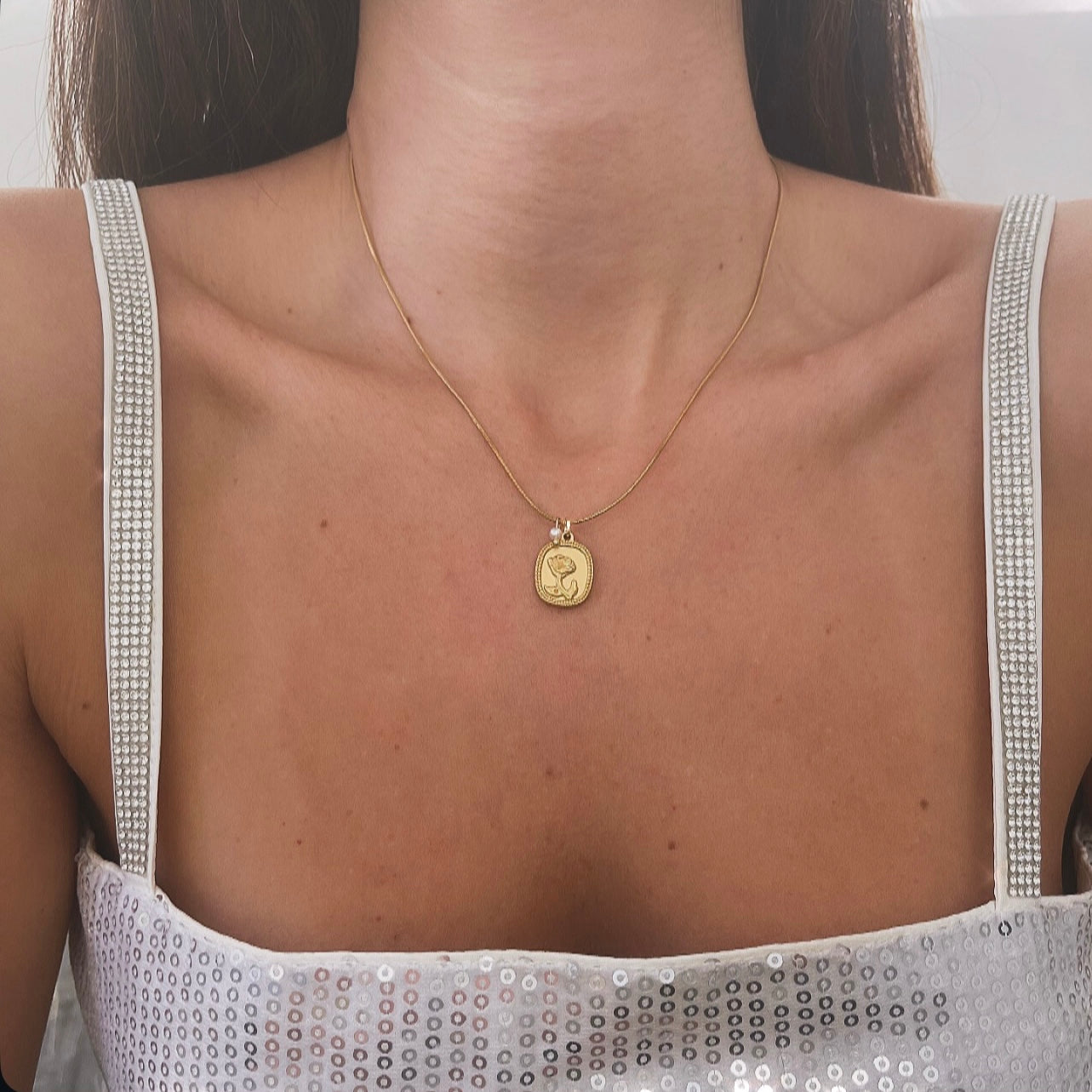 שרשרת דקה תליון מלבן פרח עם פנינה זהב